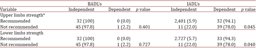 The muscle strength of the upper limbs was not associated with the ability to perform the BADL's with statistically significant levels (p= 0.401). However, when evaluating the association of upper limb strength with the capacity to perform the IADL's there was a statistical significance (p= 0.045) (Table 2).