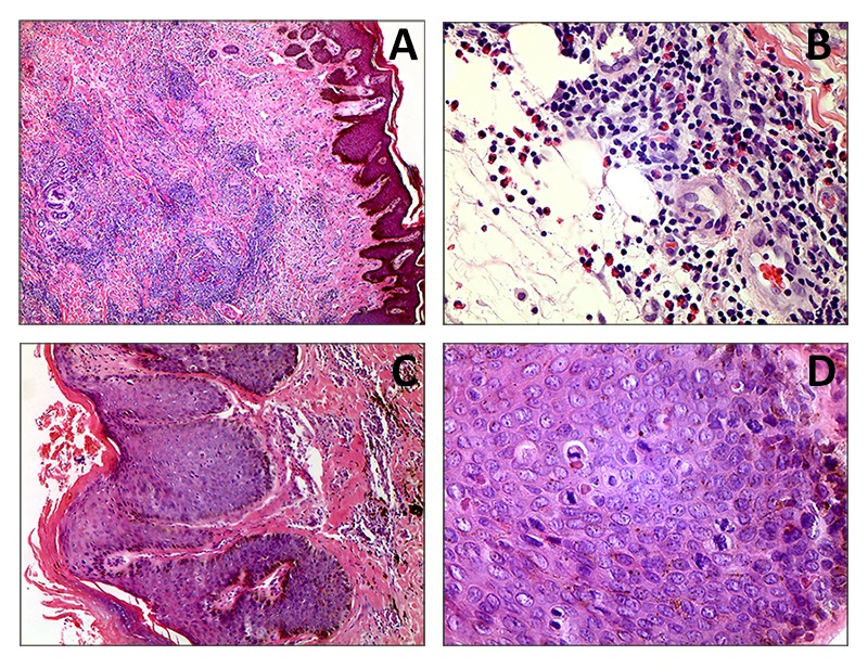 Biopsies from exophytic tumors from the left femoral region and the right knee both demonstrated verrucous carcinomas (Figure 3 C y D).