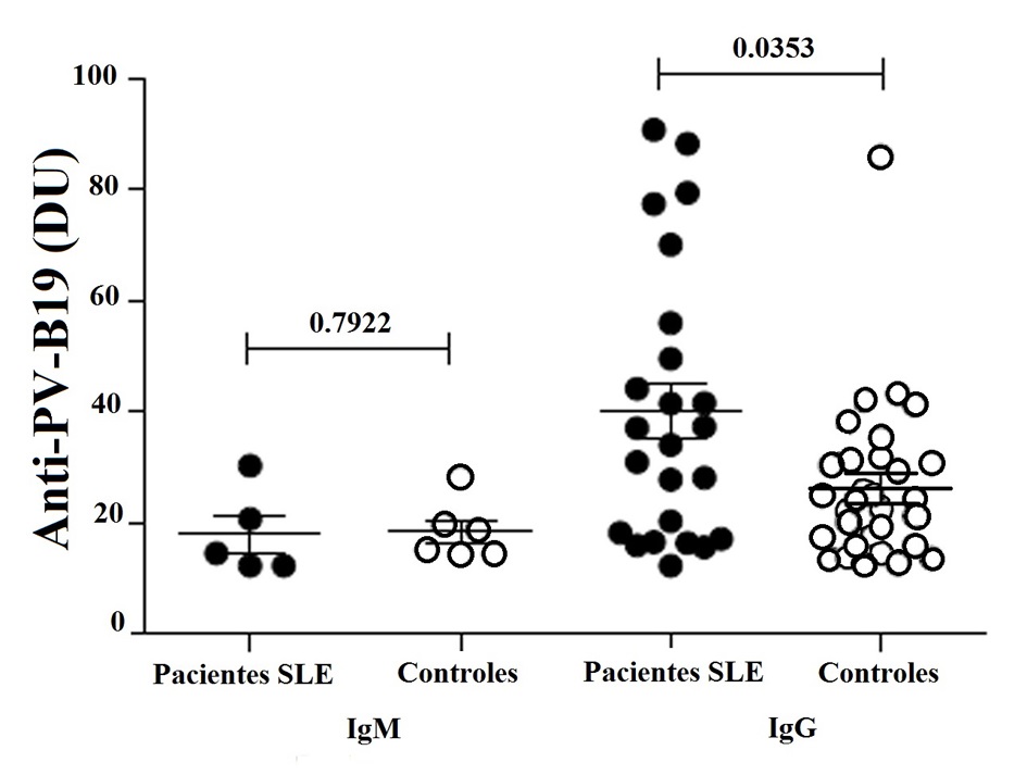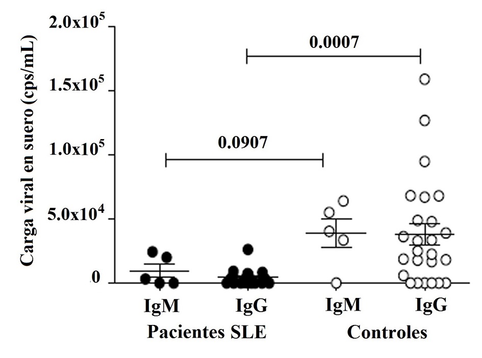 Resultados: Se determinaron niveles insignificantes de IgM en el 14.3% (4/28) de las pacientes y en el 11.4% (4/35) de los controles. IgG se detectó en el 82.1% (23/28) de los pacients y en el 82.9% (29/35) de los controles. Hubo un alta significancia en los pacientes con LES. DNA viral se encontró en el 86.0% (57/66) de los pacientes y en el 81.0% (54/66) de los controles. La carga viral se cuantifico en 28/66 pacientes y en 31/66 de los controles, la cual fueron positivos para IgM e IgG; fue significativamente mas alta en los controles.