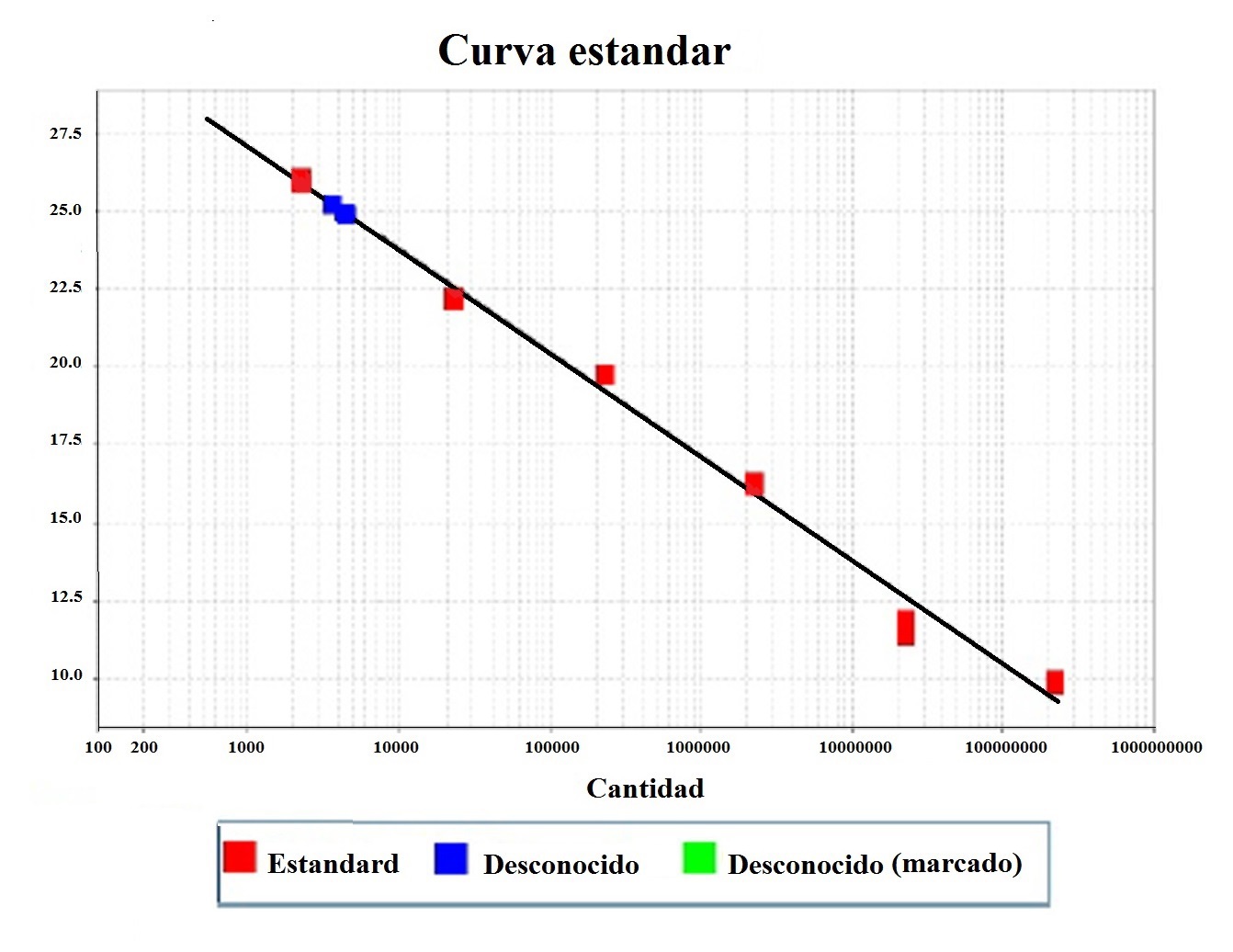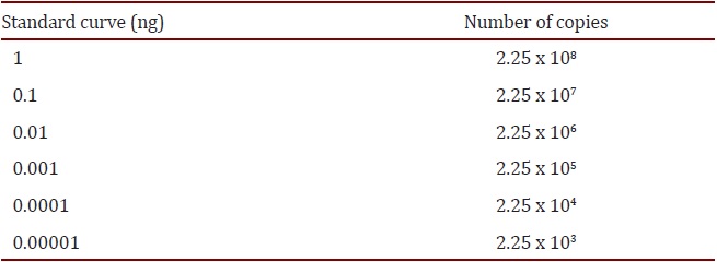 Five serial dilutions at 10 were included (Table 1). Each sample and standard curve were tested by triplicate. Amplification conditions were as follows: 2 min pre-heating at 50º C, 10 min polymerase activation at 95º C, following by 50 cycles of denaturation (95° C for 15 s), primer annealing (55° C, 40 s), extension step of 20 s at 72º C, and a final holding stage at 60° C for 30 s. Amplification reaction was performed in the StepOne (tm) Real-Time PCR System equipment (Applied Biosystems), using the Maxima Probe/ROX master mix (Thermo Scientific), primers (0.5 µM), and probe (0.1 µM). The number of copies in the samples was calculated with the StepOne software taking into account the average of CT values obtained with respect to the standard curve. Viral load are expressed in copies per milliliter of serum (cps/mL).