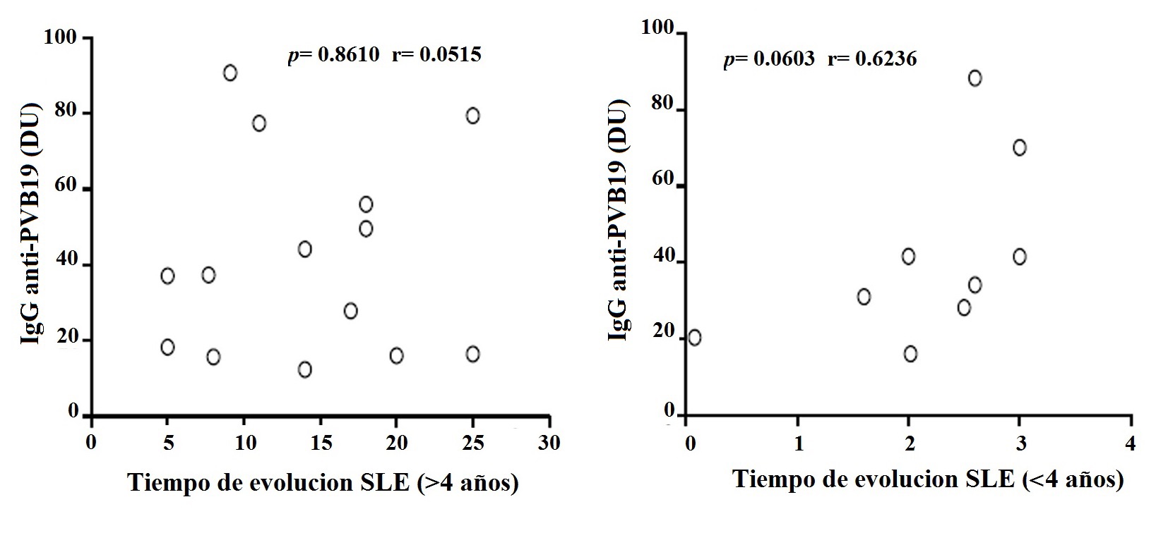 IgG is detected days after IgM, indicating resolution of infection and past or chronic infection, providing lifelong immunity 47,48. In our study, high levels of IgG antibodies were detected in SLE patients, supporting past or chronic infection. Unlike the data reported by Pugliese et al. 52, who found a significant correlation between IgG anti-PV-B19 and SLE, we found no correlation between IgG and SLEDAI; the inverse correlation observed between IgG with low disease activity (SLEDAI <4), is probably due to high IgG values in a single patient, which we consider not representative. Our data suggest that IgG levels appear to increase in SLE patients likely due to support therapy for chronic PV-B19 infection, since all of our patients were being treated with anti-inflammatory drugs, corticosteroids and immunosuppressive agents. In this regard, it has been described that the use of corticosteroids, immunosuppressive agents, and biological therapies may increase the risk of viral infection in SLE patients and PV-B19 infection could become chronic or severe on them 53,54. However, longitudinal studies are required to confirm this.