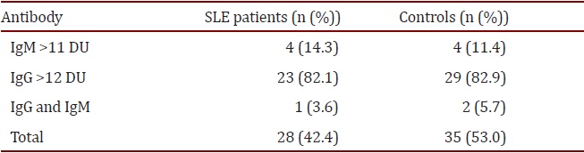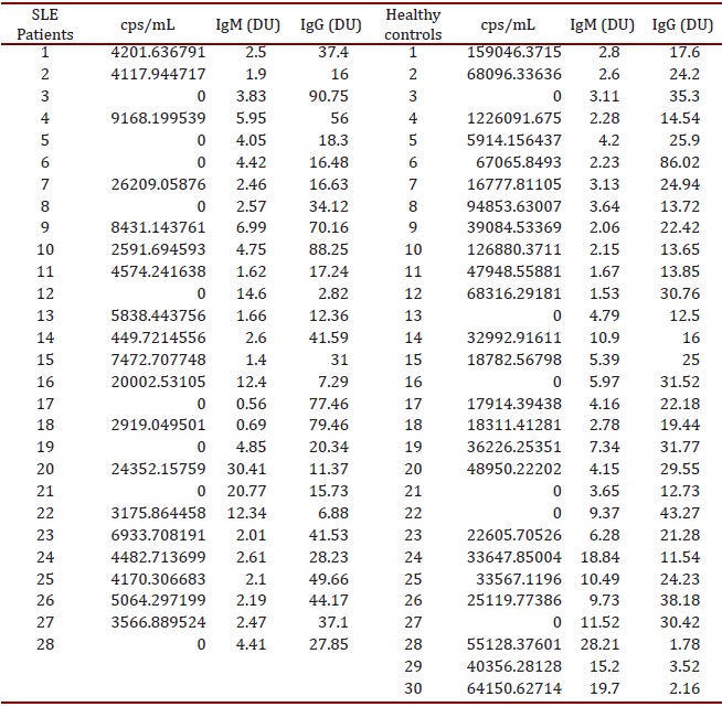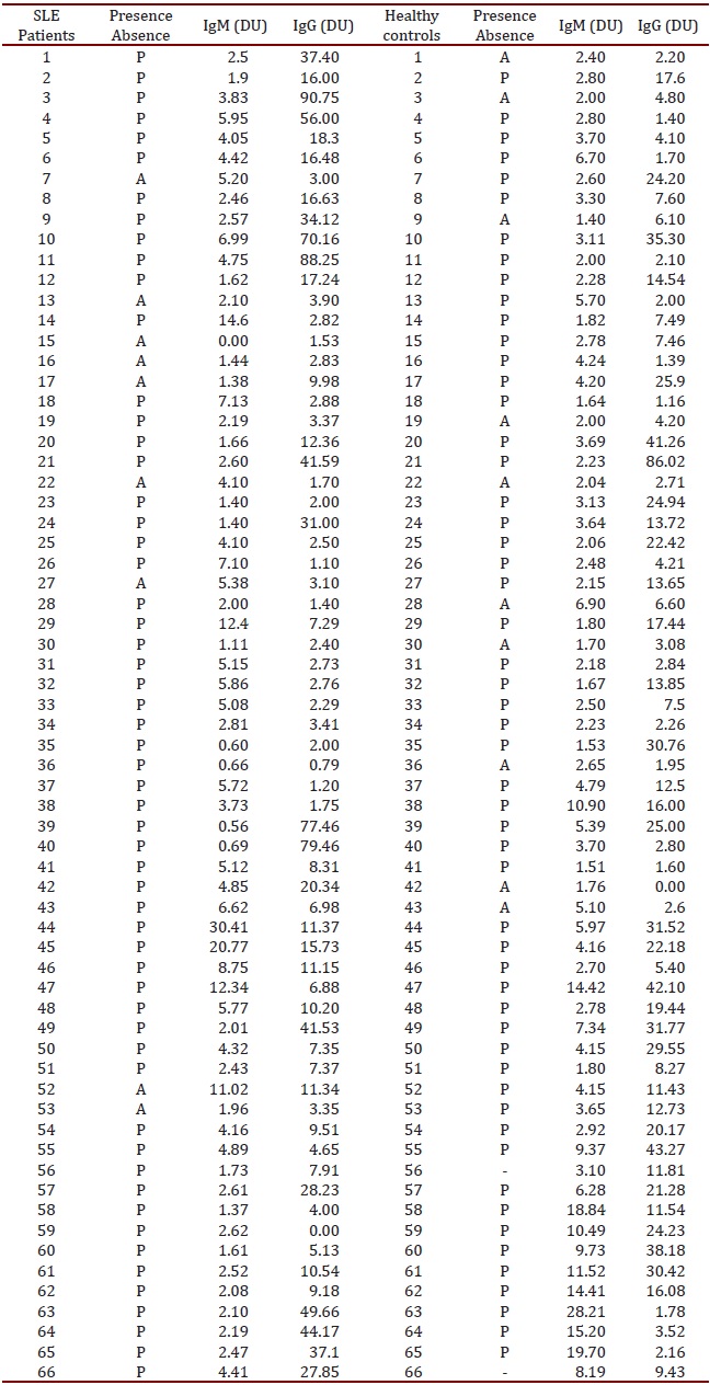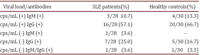Wilcoxon matched-pairs signed rank test was used to assess the significance of any difference in values of IgM and IgG, and viral load (cps/mL) among SLE patients and control subjects (p <0.05). Correlation analysis was done using the Pearson correlation coefficient. In all comparisons, the level of significance was p <0.05, using the Graph Pad Prism 5 software.