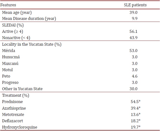 The average age of the patients and controls was 39.03 and 38.18 years, respectively. The average time with disease in patients was 9 years (Table 2). All female patients were under treatment, 56.1% of them had active disease determined by SLEDAI (>4).