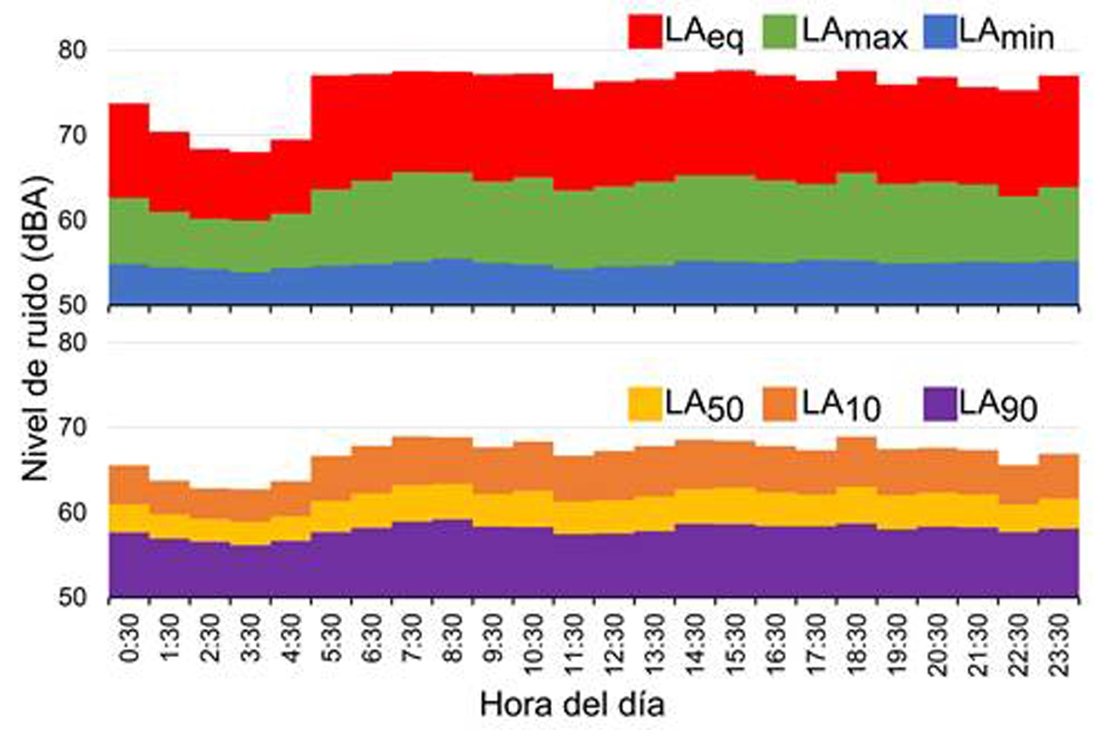 For the LAmax, values were reported in a range of 67.22 ±3.01 dB(A) (03:00) and 77.32 ±1.52 dB(A) (07:00), with a maximum value of 83.70 dB(A) (23:00) and a minimum value of 59.73 dB(A) (03:00). Finally, for the case of the LAmin, the values varied between 53.16 ±2.45 dB(A) (03:00) and 55.08 ±1.88 dB(A) (08:00), with a maximum and minimum of 61.23 dB(A) and 49.83 dB(A), respectively. The dynamic of these last two parameters was similar to LAeq (Fig. 1, above); notwithstanding, it was seen that the variation of the levels of daily noise was slightly greater in the LAmax values, followed by LAeq and LAmin.