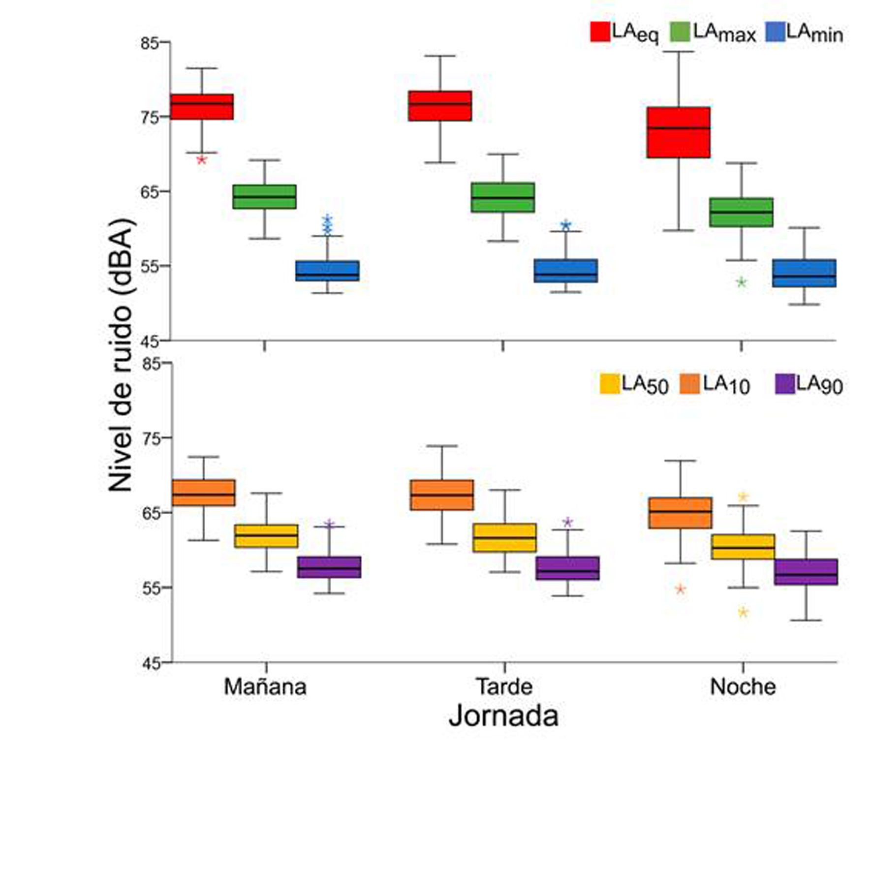 Resultados: El nivel medio reportado fue 64.00 ±3.62 dB(A), con máximo de 76.04 ±5.73 dB(A), mínimo de 54.84 ±2.61 dB(A) y ruido de fondo de 57.95 ±2.83 dB(A). Se identificaron cuatro fuentes con rango entre 16.8-63.3 dB(A). El análisis estadístico mostró diferencias significativas entre una media y otra con valores mayores en las primeras horas del día.