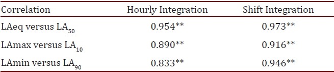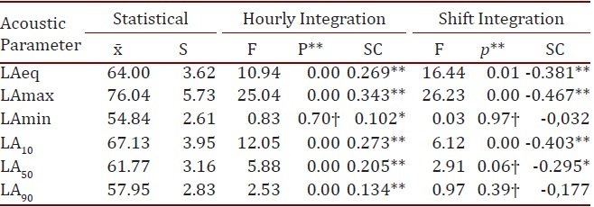 The analysis of variance showed a significant difference between one hourly average and another, with a significance level of 99% for the LAeq and LAmax, while for the LAmin, it did not. In contrast with the ANOVA, the Spearman coefficients confirmed the information, showing a significant relationship with p <0.01 between the hourly averages of LAmax and LAeq, while LAmin showed a slight relationship with p<0.05 (Table 1). These results were similar to the averages by shift, only the Spearman correlation coefficient established an indirect and significant relationship for LAeq and LAmax, and an insignificant relationship for LAmin (Table 1).