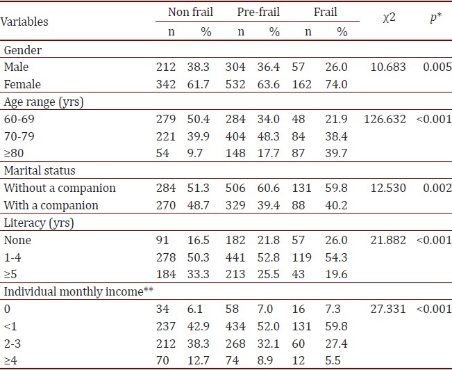 When referring to marital status, a study conducted in Brazil 6 corroborates with the present survey, since there was a larger pre-frail elders proportion without a companion when compared to non-frail.