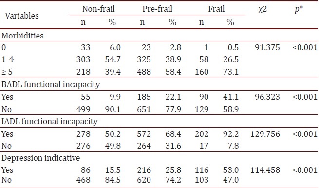 Among the reported morbidities in both groups, there was prevalence of hypertension, back and vision problems, with the highest percentage in frail, followed by pre-frail and non-frail elderly.