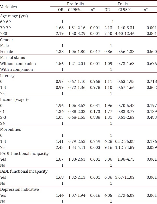 Results: The prevalence of pre-frailty condition was 52.0% and the fragility corresponded to 13.6%. Pre-frailty and frailty associated factors were, respectively: age range between 70-79 years and ≥80 years; one to four morbidities and five or more morbidities categories; functional disability for basic and instrumental activities of daily life and depression indicative; whilst lack of a companion or income and female gender were only associated to pre-frailty.