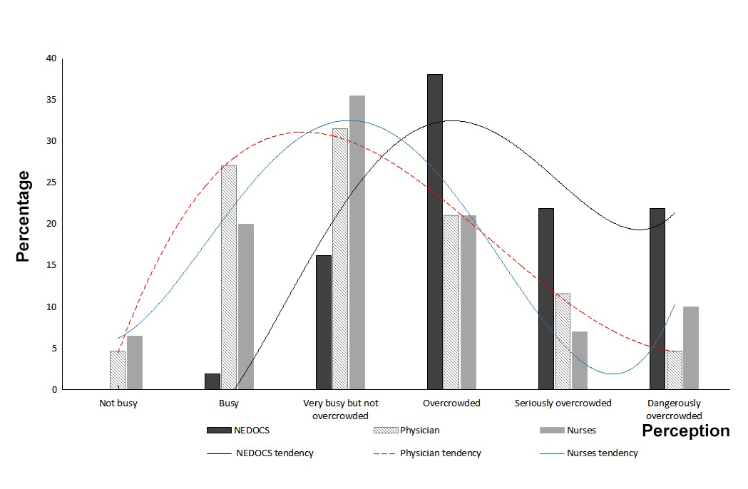 One study that compared the NEDOCS scale with health staff perceptions considered the NEDOCS to overestimate ED overcrowding 15. Unfortunately, given the design of our study, it is not possible to establish whether the NEDOCS overestimated ED overcrowding or whether the subjective perception of the health staff underestimated it. Nevertheless, it was determined that when the NEDOCS categories were high there was a real limitation on patient flow in the ED, defining the appropriate course of action for patients was slow, and there were delays in treating the patients in the study, thereby increasing patient risks.