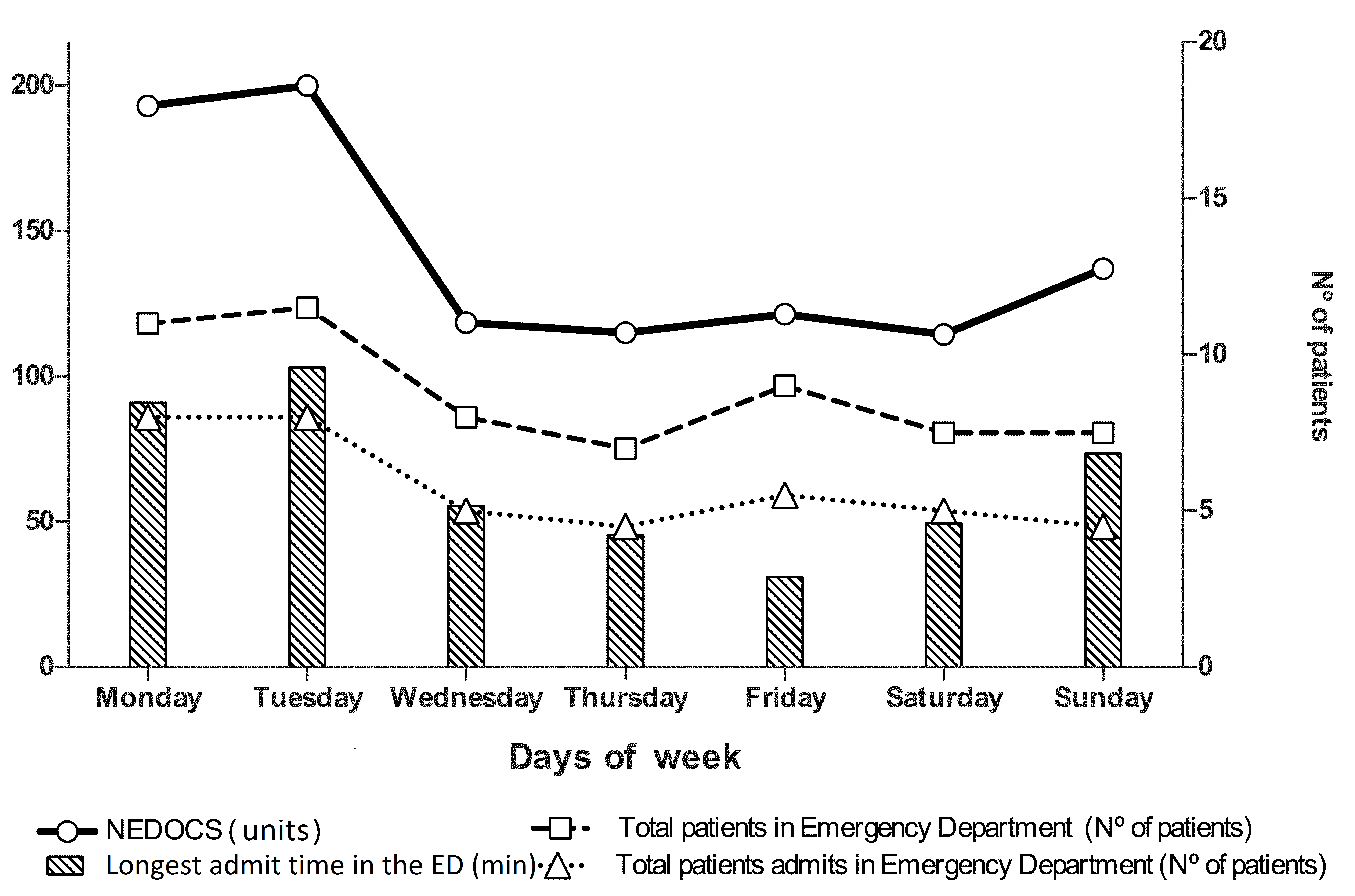 A relationship was observed between a high NEDOCS score and Mondays and Tuesdays, due to an increase in the number of patients in the ED, the number of admits and the longest admit time (patients in the ED and admitted were adjusted to the figure by multiplying the value by 10) (Fig. 2).