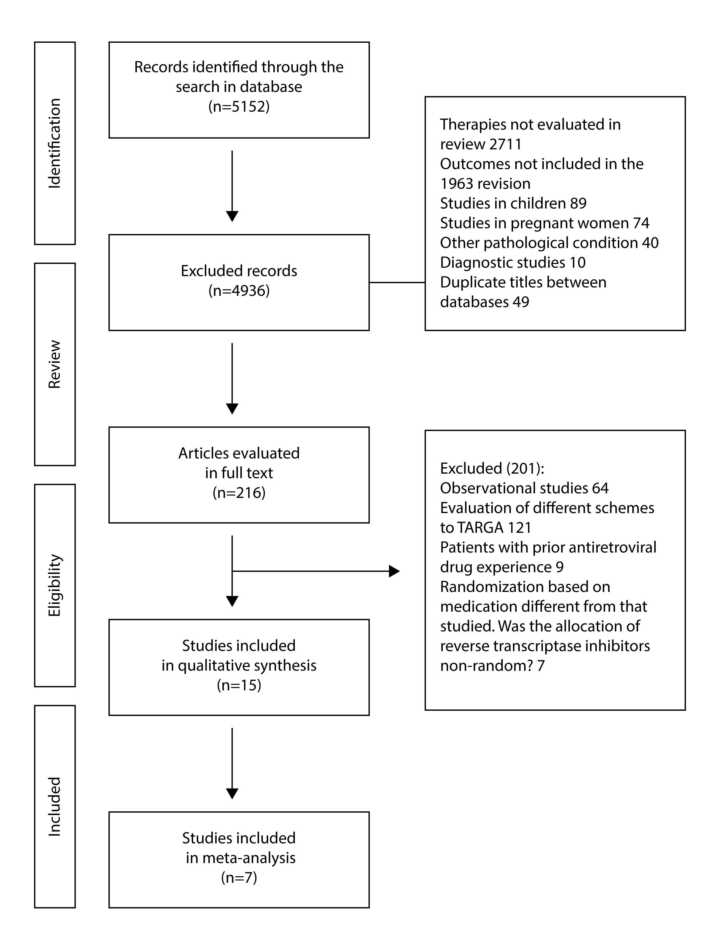 The search identified 5,152 titles from the initial evaluation, of which 4,936 were excluded after the revision of the title, abstract and due to possible duplication. 2,711 were excluded because the therapy evaluated did not correspond to the one included in the review, 1,963 evaluated outcomes not studied in our review, 89 were studies of children, 74 of pregnant women, 40 studied treatments for another pathological condition associated with HIV, 10 corresponded to diagnostic studies and 49 duplicate titles were detected between the databases. The remaining 216 articles were reviewed fully, verifying eligibility criteria. Following this review, we obtained 15 publications corresponding to 7 studies, 5 comparing ABC/3TC vs. TDF/FTC, one ZDV/3TC vs. TDF/FTC and one ABC/3TC vs. ZDV/3TC (Fig. 1).