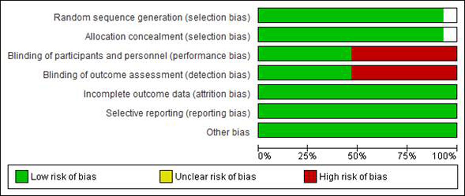 The risk of bias according to the domains recommended by the Cochrane Collaboration was evaluated with the following results (Fig. 3). Although some studies were at risk of bias because they had not been blinded and although in the publications the reasons for this were not found, it was considered satisfactory to keep them for the analysis considering that they all fulfilled the condition of adequate random assignment.