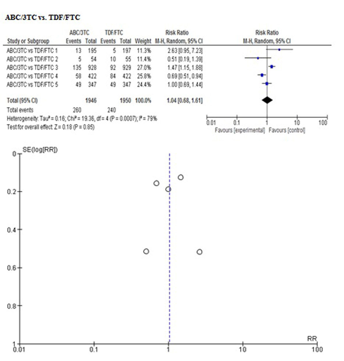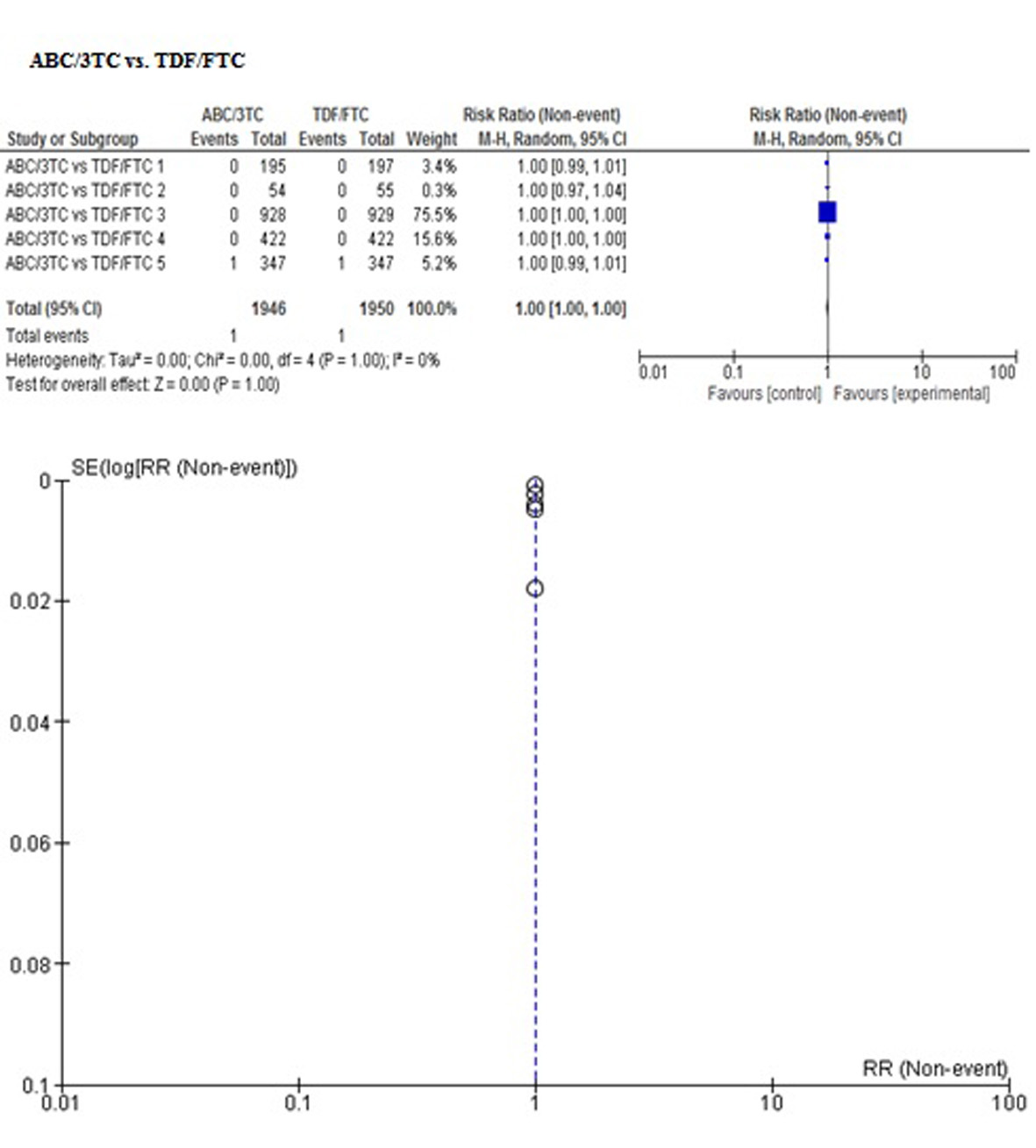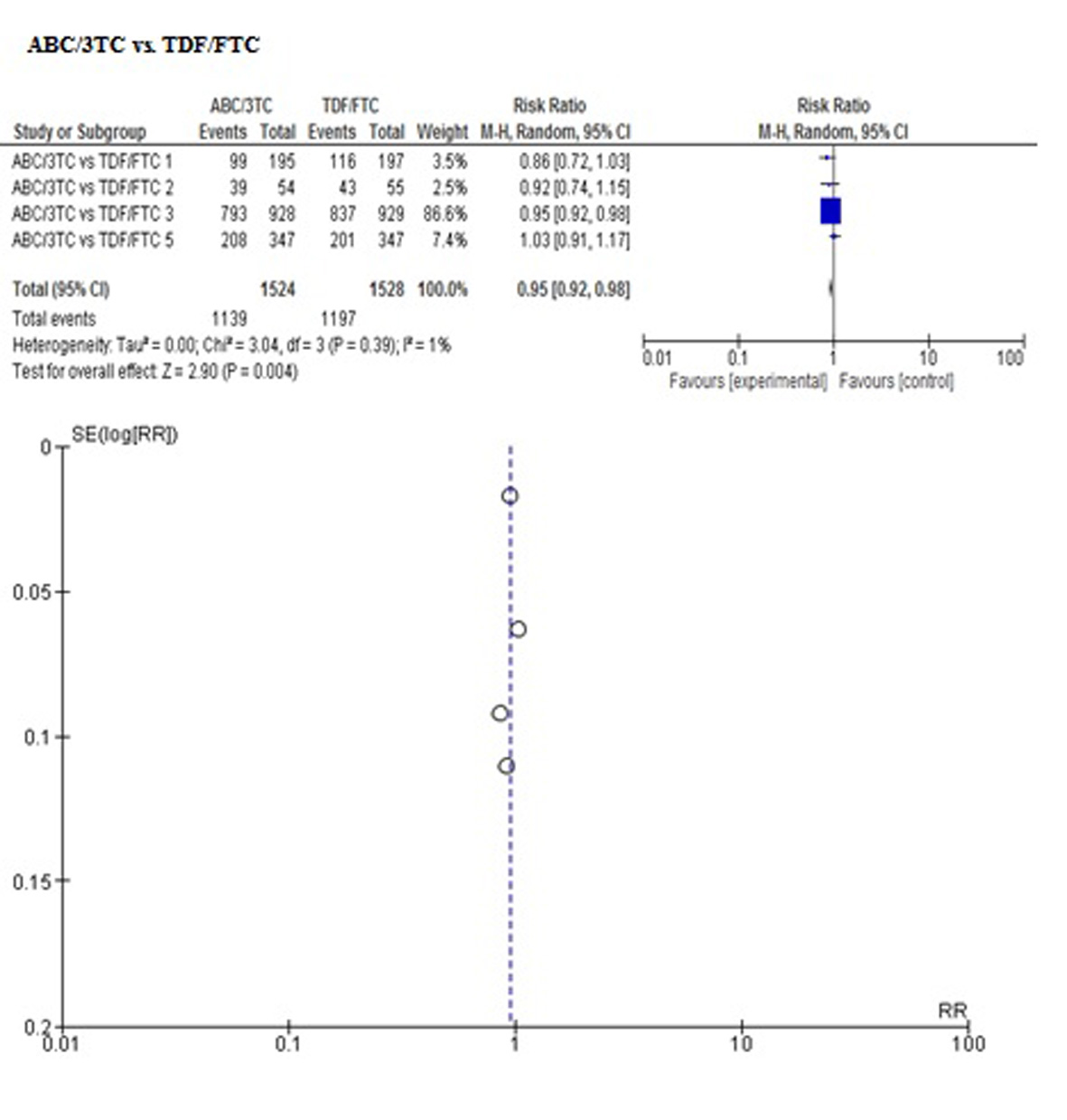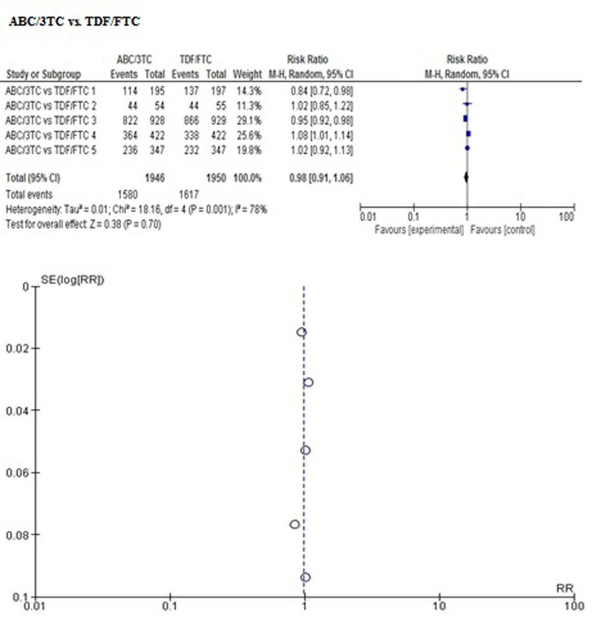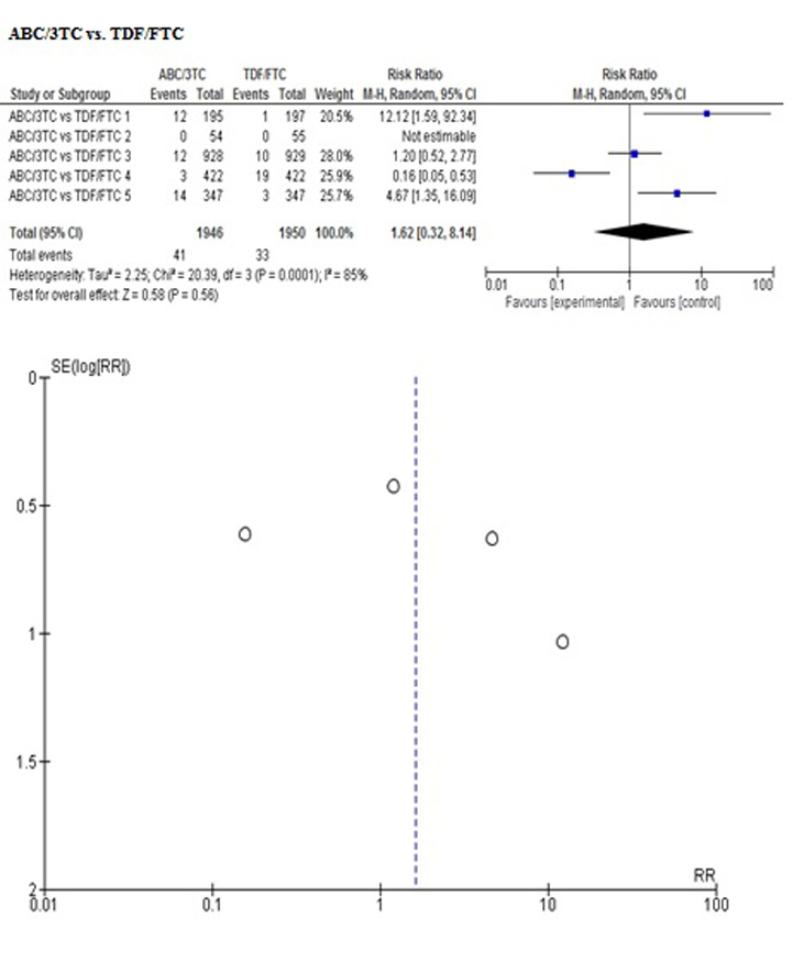 In order to control the reporting biases, the search for information was developed according to the established protocol. In addition, a visual inspection of bias in the report was performed by means of a funnel plot for each outcome (figures are attached in Appendix 2), observing symmetry in all of them but not being able to perform tests for asymmetry for the number of included studies, between 4 to 5 in each meta-analysis performed on the direct comparison ABC/3TC vs. TDF/FTC.