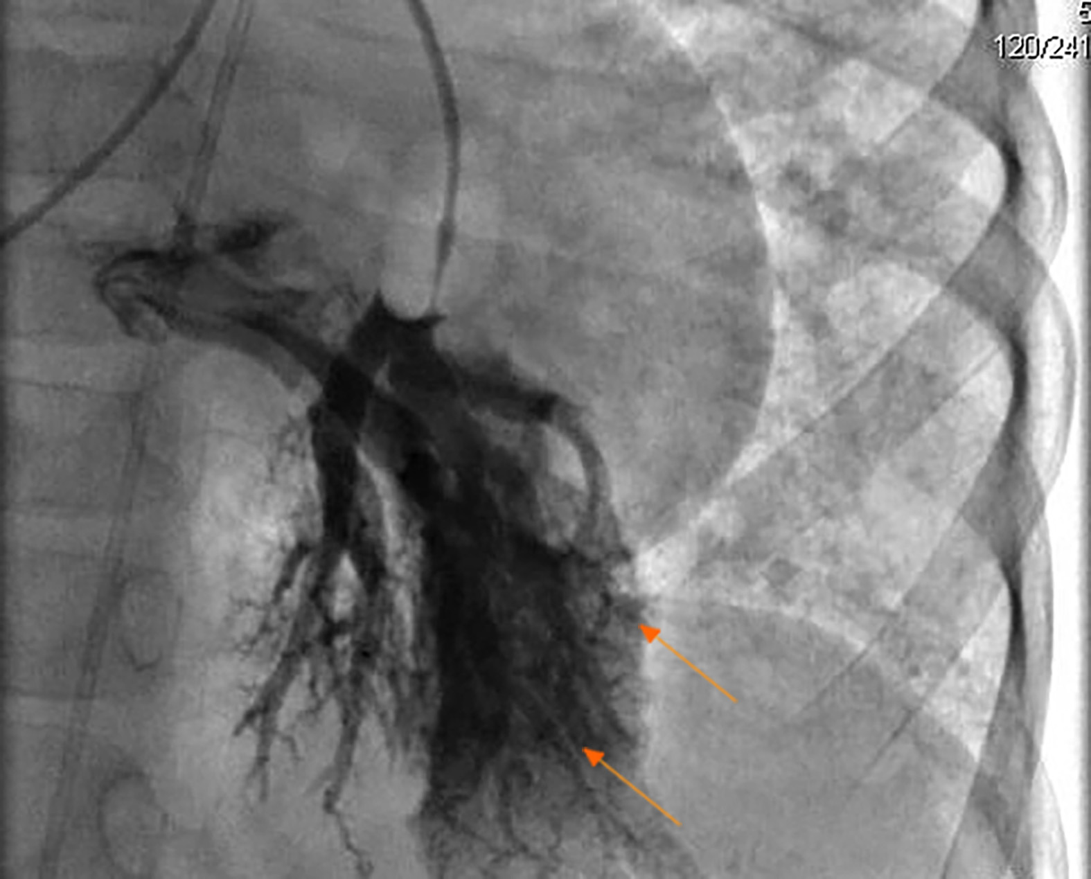During hospitalization, the patient presented several episodes of epistaxis, and deterioration of cardiopulmonary function with higher oxygen requirements secondary to pulmonary arteriovenous shunts. Gastrointestinal, liver or central nervous system shunts were discarded. Because of episodes of spontaneous and recurrent epistaxis, and the presence of multiple telangiectases and pulmonary AVMs, the diagnosis of HHT (Rendu-Osler-Weber) syndrome was made, despite of having no family history. Immunodeficiencies or lymphoproliferative disorders were excluded. Hepatopulmonary syndrome (HPS) was also ruled out based on the presence of pulmonary AVMs, multiple telangiectases, and epistaxis that were compatible with HHT over HPS. Patient required high-flow oxygen, bronchodilators and antihypertensive treatment. Five catheterizations for management were required with the implantation of more than 60 coils. The initial interventional catheterization treated AVMs localized on the right inferior lobe (15 embolizations). The second and the third catheterizations were done in the left inferior lobe and lingula. In the fourth catheterization, recurrence was evidenced in the left lung and new AVMs were found in the right inferior lobe requiring new embolizations.