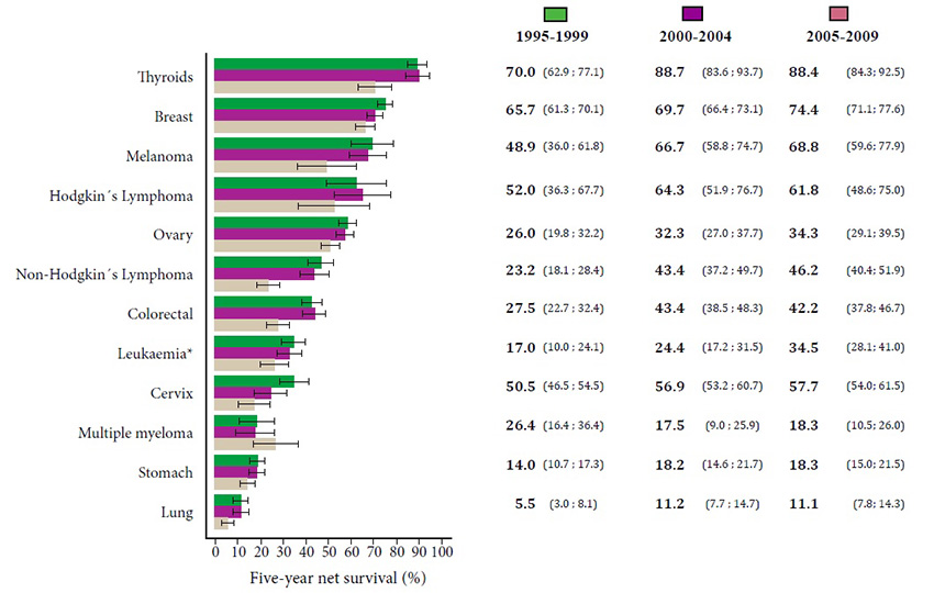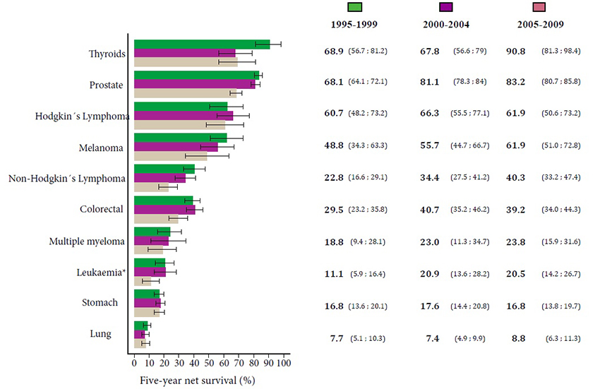 On the other hand, the highest estimates of net survival for the period 2005-2009 were seen for thyroid cancer (89.3%), prostate (83.2%), breast (74.4%) and melanoma (65.8%). In the case of hematolymphoid neoplasms, survival was better in patients with Hodgkin lymphoma (64.4%) than in non-Hodgkin lymphoma (43.3%). In leukemia and multiple myeloma survival was lower, with estimates for the 2005-2009 period of 28.1% and 22.8% respectively.