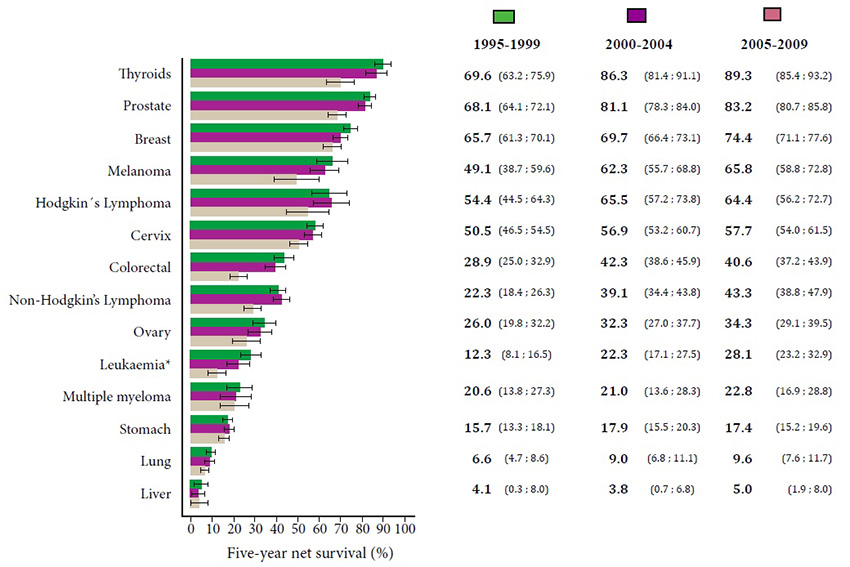 Results: Prostate and breast cancer were the first cause of cancer morbidity. The incidence rates in these were susceptible to early detection, tumors stabilized after decades of growth, while an increase in the incidence of colon cancer and papillary thyroid carcinoma was observed. The incidence rates of cervical and stomach cancer and conditions related to infectious agents decreased, although the number of absolute cases increased, due to the growth and aging of the population. Gastric cancer was responsible for the highest number of cancer related deaths. The types of cancer related to tobacco consumption (lung, oral cavity, esophagus, pancreas, urinary bladder) showed low numbers and a tendency to decrease. During the period 2000-2004, the 5-year net survival improved for cancers of the breast, cervix, prostate, melanoma and thyroid, although in the period 2005-2009 a stagnation was observed. In stomach, liver and lung cancer, the 5-year net survival was less than 15%. The 5-year overall survival in children was 51.0% (95% CI: 47.5, 54.3) and in adolescents 44.6% (95% CI: 36.0, 52.8).