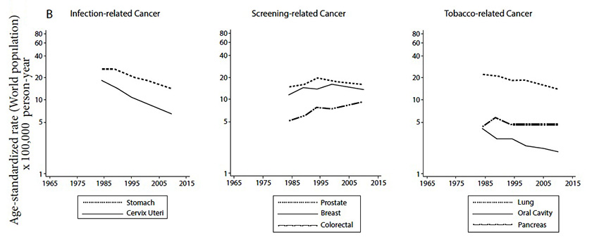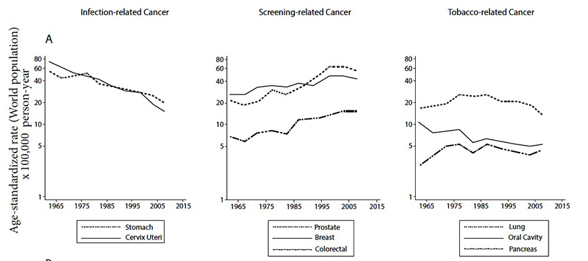 The incidence and mortality rates for stomach and cervix uteri cancer have decreased significantly over the last 55 years (Fig. 3). The descent is monotonic, continuous and began before knowing the prominent role in the processes of carcinogenesis of Helicobacter pylori28 and the Human Papilloma Virus (HPV) 29. These changes are not related to specific interventions against these infectious agents, they are the result of progress in the development and improvement of sanitary conditions. Economic development determined changes in lifestyles and modifications of the known risk factors for gastric cancer. Refrigeration facilitates the consumption of fresh foods and limits the use of chemical-based food preservation methods (salting, desiccation, smoking, and acidification).