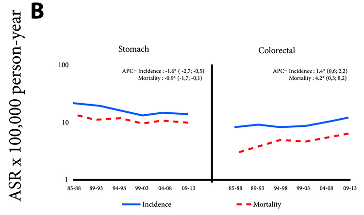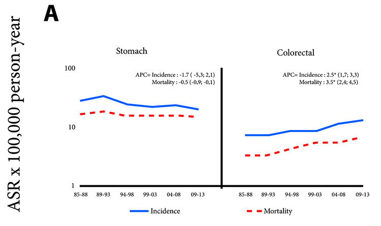 Colon-rectal cancer had a significant upward trend in both APC, men (2.5) and women (1.4). The values were very similar for both genders. Mortality rates, in men and women, increased significantly (3.5 and 4.2, respectively)