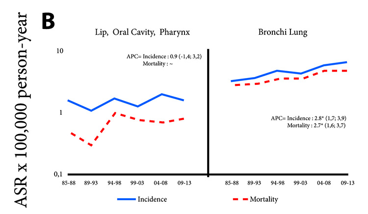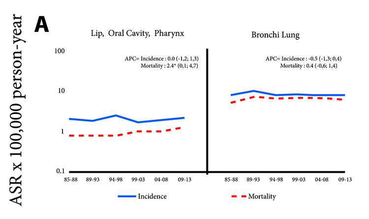 In the 29 years of analysis, the incidence and mortality rates from lung cancer among men have remained stable. However, in women the increase was significant with a APC of 2.8 in incidence and 2.7 in mortality. There was a sustained and large increase in both the incidence rate and the mortality rate of prostate cancer with an APC of 3.8 and 3.7 respectively.