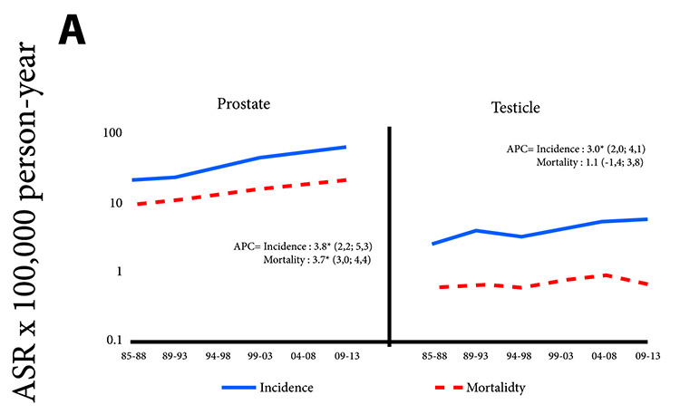 In men, the great increase in prostate cancer incidence rates is associated with an improvement in early diagnosis, mainly due to the use of prostate antigen. It would be expected that this very important increase is accompanied by a decrease in the mortality rate, however, as has been observed in other countries 21, there was no impact on the decrease in mortality.