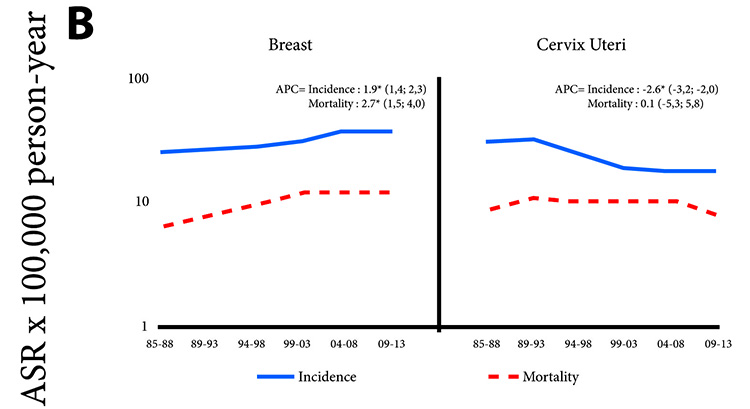 Breast cancer had an incidence and mortality rates that increased significantly (APC 1.9 and 2.7), however in the last three quinquennial periods the mortality rates remained stable.