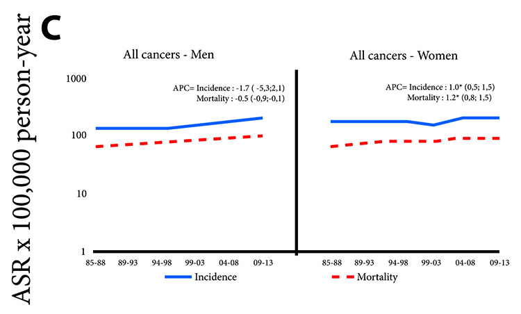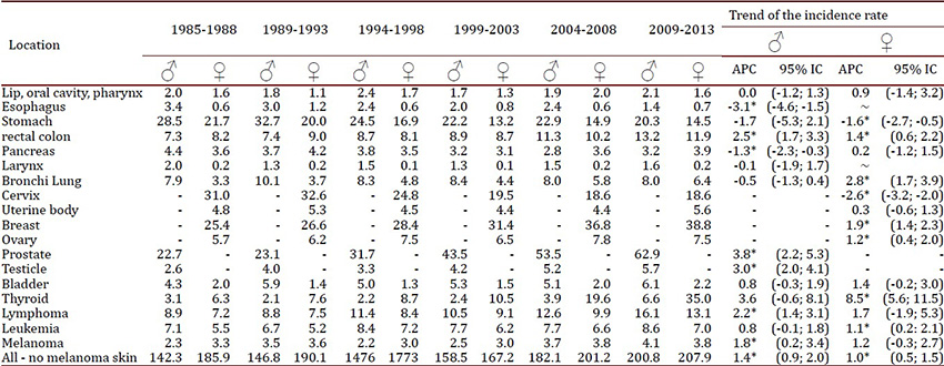 Results: A decrease in the incidence and mortality rates of cervical and stomach cancers were documented. There was an increase in breast and colorectal cancer rates. The increase of the incidence rate of thyroid cancer in women was notorious. Lung cancer also increased in women while in men their values remained stable.