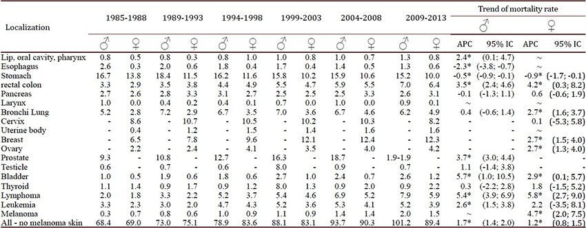 The NTR has a 4th version computer system adjusted to the needs of the implemented methodology. The data is presented according to the International Classification of Diseases ICD 10, and analyzed, by sex, incidence and mortality rates standardized by age (using a world standard population and direct method). Analysis data included the following six periods: 1985-1988, 1989-1993, 1994-1998, 1999-2003, 2004-2008 and 2009-2013, in selected locations of the body. To study the trend of cancer incidence and mortality rates during the 1985-2013 period, the average annual percentage change (APC) was estimated. In describing the change, the terms '' increase '' or '' decrease '' were used when the APC was significantly different from zero (p <0.05); otherwise, the term "stable" was used. Significance tests were performed using the Monte Carlo permutation technique. All analysis were performed in the Joinpoint Regression Program version 4.5.0.1 of the Surveillance Research Program of the National Cancer Institute of the United States.