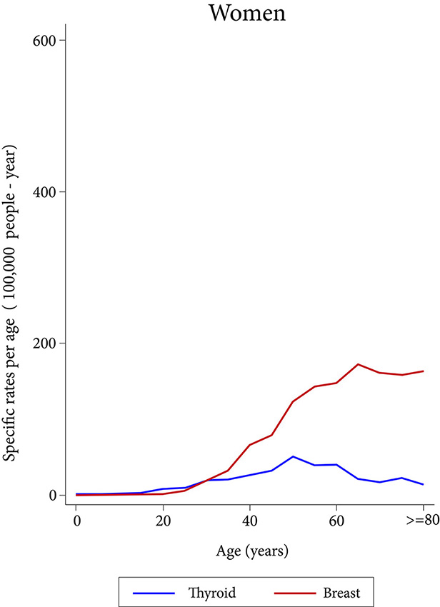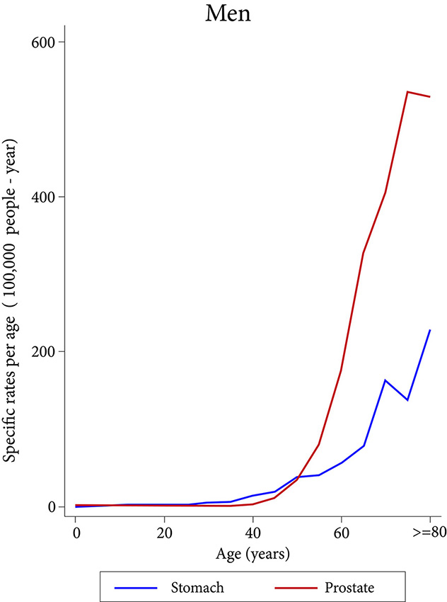 The behavior of the age-specific incidence of the two most frequent types of cancer in women is different. Breast cancer rises sharply since the end of the third decade of life, reaching its peak at around 70 years of age; in contrast, the incidence of thyroid cancer begins in the middle of the second decade of life, and reaches its peak at around 55 years of age, with a magnitude 60% lower than that of breast cancer at this age (Fig. 1). In men, the incidence of gastric cancer increases after 30 years of age, and that of the prostate increases after 40 years of age, but the latter presents a much steeper upward curve, almost tripling the incidence of gastric cancer at 80 years of age (Fig. 2).