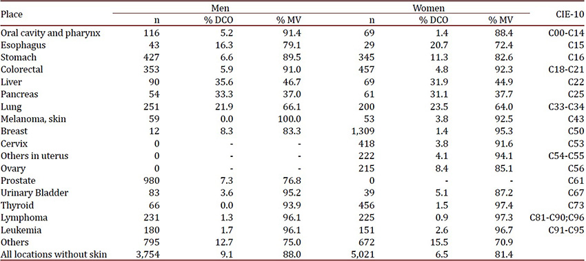 In women, the five tumor sites with a percentage of microscopic diagnosis greater than 95.2% were: thyroid, lymphoma, leukemia, kidney and breast. In men, they were skin melanoma, leukemia, lymphoma, bladder and thyroid. The type of cancer with the highest percentage of diagnosis by death certificate was: liver (31.9% in women and 35.6% in men), pancreas (31.1% in women and 33.3% in men) and lung (23.5% in women and 21.9% in men).
