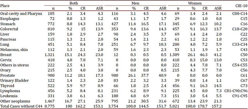 Results: During the five-year period, 8,775 incidents of cancer were recorded (excluding non-melanoma skin cancer). The global standardized incidence rates per 100,000 person-years were 151.7 in men and 157.2 in women. The main locations were prostate, stomach and colorectal, in men; breast, thyroid and colorectal in women. The standardized mortality rate per 100,000 person-years was 94.8 in men and 78.0 in women.