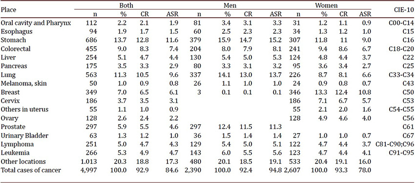 Women had a standardized mortality rate by age of 78.0 per 100,000 women-year. The cancers that caused the greatest number of deaths were breast (13.3%), stomach (11.8%), colorectal (9.4%), lung (8.7%), cervix (7.1%), liver (4.8%), leukemia and lymphomas. (4.7% each). In men, the mortality rate standardized by age was 94.8 per 100,000 men-year, cancers of stomach (15.9%), lung (14.1%) and prostate (12.4%), colorectal (8.0%), liver (5.4%), leukemia (6.0%) and lymphoma (5.4%) (Table 3 ).