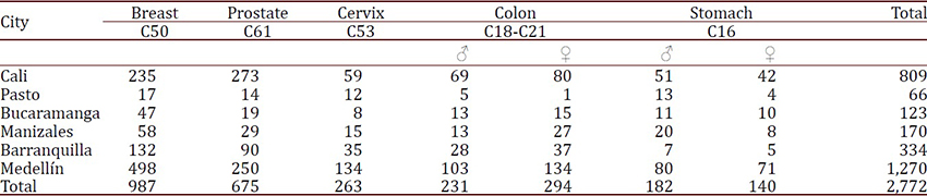 Table 1 describes the number of new cancer cases prioritized in the Ten-Year Plan for Cancer Control in Colombia that were notified to the CAC during 2015 in the six cities studied.