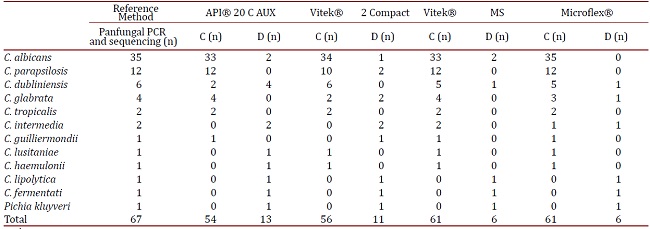Methods: Sixty-seven Candida isolates were tested by; API® 20C-AUX, Vitek®2 Compact, Vitek®MS, Microflex® and a molecular test (panfungal PCR and sequencing). The commercial cost and processing time of the samples was done by graphical analysis.