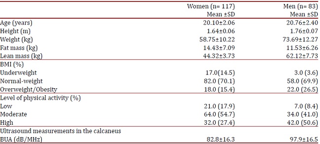 Methods: The study population consisted of 200 subjects (117 women and 83 men) aged between 18 and 25 years (mean age 20.4 years ±2.2 years). Body composition parameters were measured by an electronic balance (TANITA BC-418MA), nutritional habits were estimated by 72-h dietary recall, level of physical activity was assessed by the International Physical Activity Questionnaire (IPAQ) and bone mass was measured by ultrasonography at the calcaneus.