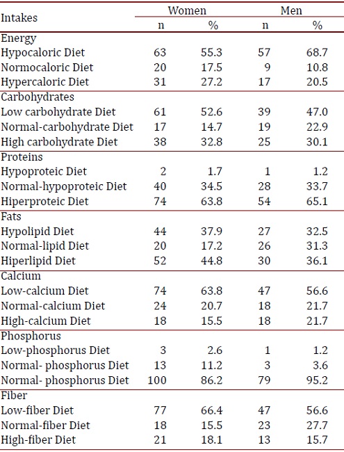 An analysis of nutritional habits was conducted according to gender including macronutrients (carbohydrates, proteins and lipids) and micronutrients (calcium, phosphorus and fiber) intakes (Table 2). No statistically significant differences were found in dietary patterns between men and women (data not shown). Note that imbalances in energy intake, macro and micronutrient intakes were observed. Most prevalent diet was hyperphotheic and hyperlipidemic and calcium and fiber intakes were below the recommendations in both gender. In contrast, a high intake of phosphorus was identified.