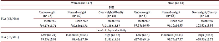 Bone mass according to BMI categories (underweight, normal-weight and overweight / obesity) and levels of physical activity (low, moderate and high) are shown in Table 3. Statistically significant differences were observed in BUA values between underweight and normal-weight subjects (p= 0.001), normal-weight and overweight / obesity (p= 0.001) and underweight and overweight / obesity (p <0.001) in women. In men, no significant differences were found. Regarding the level of physical activity, statistically significant differences were found between subjects with low and moderate levels of physical activity (p= 0.021), and with low and high levels of physical activity (p= 0.015) in men.