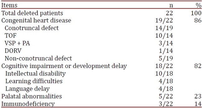 All 22 deleted patients had craniofacial dysmorphisms suggestive of DGS or VCFS and at least one major phenotypic feature. A heart anomaly, mainly a conotruncal defect, was documented in 86% (19/22). The conotruncal defects observed in 14/19 patients were TOF (10/14), ventricular septal defect+pulmonary atresia (3/14), and double-outlet right ventricle (1/14). The remaining five patients had a non-conotruncal defect each: atrial septal defect+aortic valve insufficiency, mitral valve prolapse, patent ductus arteriosus, ventricular septal defect+atrial septal defect+overriding aorta, and isolate ventricular septal defect. Eighty-two percent (18/22) had cognitive impairment or development delay: 10/18 intellectual disability, 4/18 learning difficulties, and 4/18 language delay. Palatal abnormalities and immunodeficiency were seen in 23% (5/22) and 14% (3/22), respectively (Table 1). Among the 17 non deleted patients, 12 had heart defects such as TOF (4/12), isolate ventricular septal defect (2/12) or other anomalies (6/12). All six patients without 22q11.2 deletion and tested for a 10p loss were negative. According to specific clinical suspicions, the ratio of patients with a proven 22q11.2 deletion was as follows: 3/5 with DGS, 9/14 with VCFS, 2/5 with CATCH22, 3/7 with 22q11.2DS, 2/3 with TOF, and 3/5 with complex cardiopathy. Three patients without the 22q11.2 deletion had an abnormal G-banded karyotype: 46,XX,r(22)(p12q11.2).ish r(22)(TUPLE1+,ARSA-), 46,XX,rec(22)dup(22q)inv(22)(p11.2q13.2)pat, and 47,XX,+18.