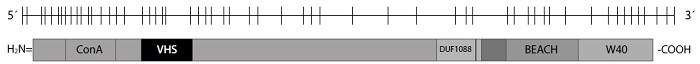 In addition to these domains, LRBA seems to contain a VHS domain (VPS (vacuolar protein sorting)-27, Hrs (hepatocyte growth factor-regulated tyrosine kinase sustrate) STAM (signal transducing adaptor molecule) domain) 13.