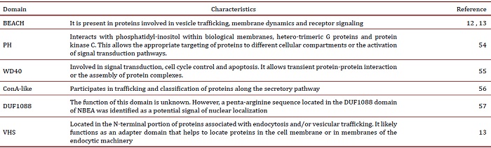 This protein has different domains and among them, the BEACH domain (beige and Chediak-Higashi) is the most characterized. This domain, with (280 amino acids in length, is conserved in several proteins grouped overall as the BEACH domain containing proteins (BDCP) 10, and is mostly located towards the C-terminal 11,12. The function of this domain is unknown and the sequence does not show homology with any other protein in the human proteome database 11,12. In addition to the BEACH domain, the BDCP shares the ConA-like domain (concanavalin A-like), PH (Pleckstrin homology) and WD40 (repeats of tryptophan and aspartic acid) domains. On the other hand, the domain DUF1088 (domain of unknown function 1088) is shared only by LRBA and its paralog neurobeachin, which may indicate specific functions of these two proteins not shared by other members of the BDCP.