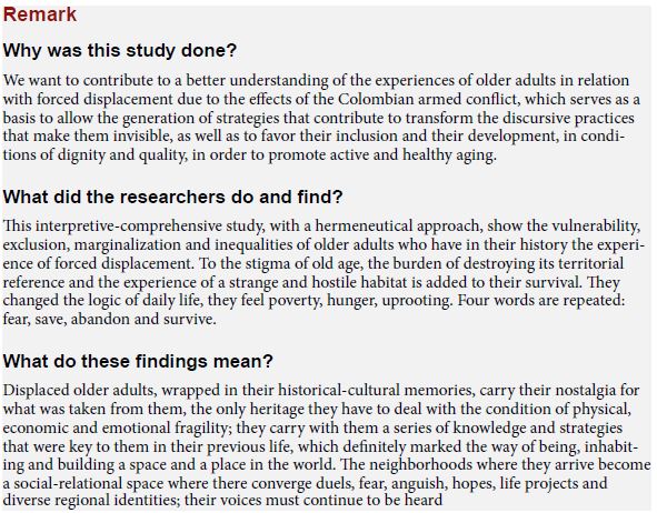 Conclusión: Cuando hay desplazamiento, las personas mayores no solo se despojan de su tierra, de su casa, sino de su cosmos, de sus referentes vitales y se modifica su trayectoria de vida y su lugar en el mundo. Las intervenciones deben ser diseñadas basadas en análisis particulares y contextuales específicos.
