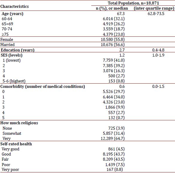 Socio-demographic variables included age (years; 60-64, 65-69, 70-74, ≥75), gender (male or female), marital status (married or unmarried), socioeconomic status (SES), and education (years). Other variable was medical comorbidity which was assessed including the presence of seven medical conditions: hypertension, diabetes, coronary heart disease, arthritis, stroke, chronic obstructive pulmonary disease, and cancer. Respondents were asked: “Has a doctor or a nurse told you that you have...?” for each of the conditions listed above. Counts of comorbidities were determined (ranging from 0 to 5) and were analyzed as a continuous variable.