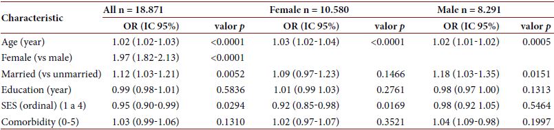 Resultados: La edad avanzada, el sexo femenino, estar casado, y tener bajo nivel socioeconómico se asociaron con ser más religiosos. Los análisis multivariados demostraron que ser más religioso se asociaba con mejor salud autoevaluada (OR= 0.92; IC 95%= 0.86-0.99; p= 0.038). Sin embargo hubo una interacción significativa entre género y religiosidad sobre la salud autoevaluada (p= 0.002), tal que la relación entre religiosidad y salud fue mas fuerte en los hombres (OR= 0.86; IC 95%= 0.79-0.94; p= 0.001), pero no fue significativa en mujeres.