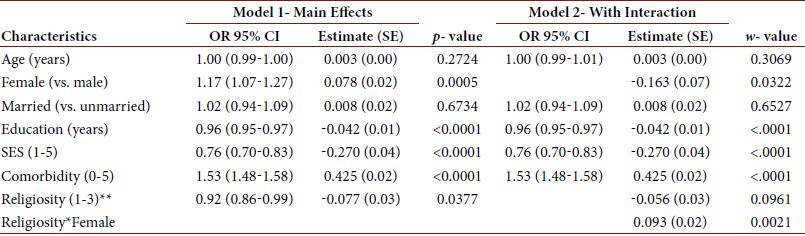 Results: Those who were more religious were older, female, had lower socioeconomic status, and were more likely to be married. Multivariate analyses demonstrated that older adults who were more religious had better self-rated health (OR: 0.92, 95% CI: 0.86-0.99, p= 0.038); however, there was a significant interaction effect between gender and religiosity on self-rated health (p= 0.002), such that the relationship between religiosity and health was stronger in men (OR: 0.86, 95% CI: 0.79-0.94, p= 0.001) but not significant in women.