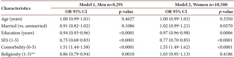 Multivariate analyses indicated that older adults who were more religious had better self-rated health (p= 0.038) (Table 3, Model 1). Other factors associated with better self-rated health were higher level of education and SES. By contrast, factors associated with worse health were female gender and higher comorbidity. There was a significant interaction between gender and religiosity on self-rated health (Table 3, Model 2; p= 0.002). We did additional adjusted analyses separated by gender where men tend to have better health when being more religious (Table 4, Model 1, OR: 0.86, 95% CI: 0.79-0.94, p= 0.001) but the association was not significant in women (Table 4, Model 2).