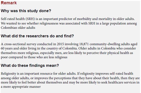 Nevertheless, the study also has a number of strengths, including the large sample of Colombian older adults who were representative of the urban and rural areas of Colombia; the control for multiple covariates using regression analyses; and as noted earlier, the uniqueness of this study as one of the first to examine religiosity and self-rated health in older Colombians country-wide.