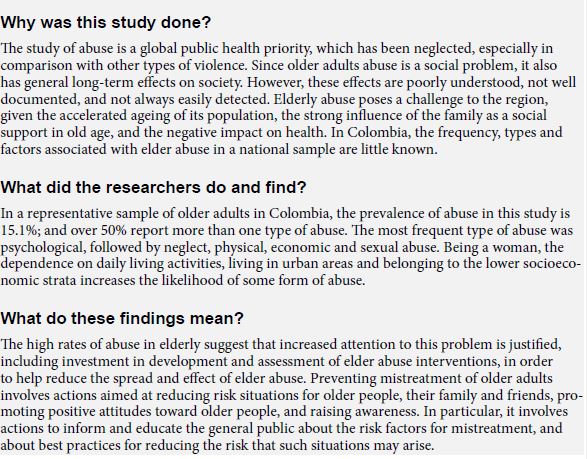 Keywords: Abuse, elderly, aged, aging, family, elder abuse, physical abuse, domestic violence, surveys and questionnaires, caregivers, socioeconomic factors, social class, Colombia.