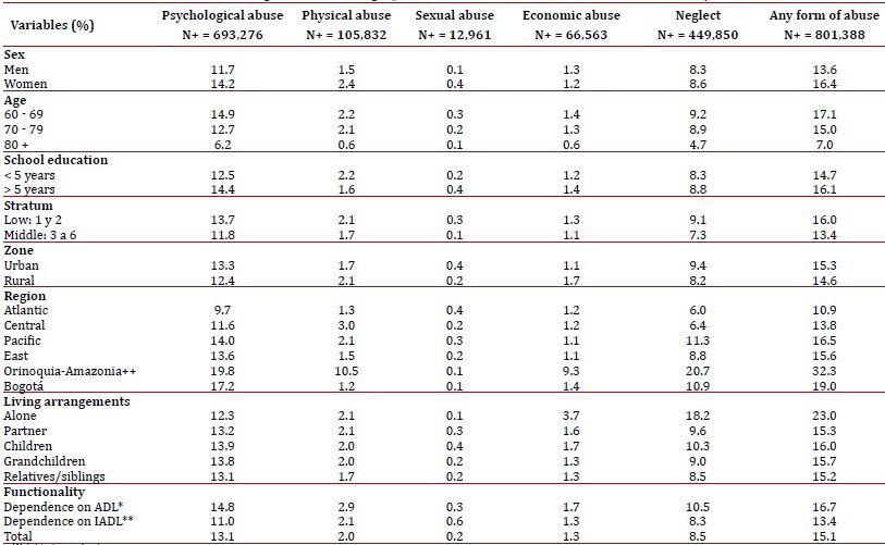Results: 15.1% of the elderly in Colombia reported some type of abuse, and over 50% reported more than one form of abuse. Abuse proportion is greater in people who are aged 60-69, in women, people with lower levels of education, people who belong to lower socioeconomic status, people who live alone, people who live with children, and people in urban areas. The most frequent abuse form is psychological, followed by neglect and physical abuse. Dependence on basic and instrumental daily living activities increases the probabilities of suffering abuse.