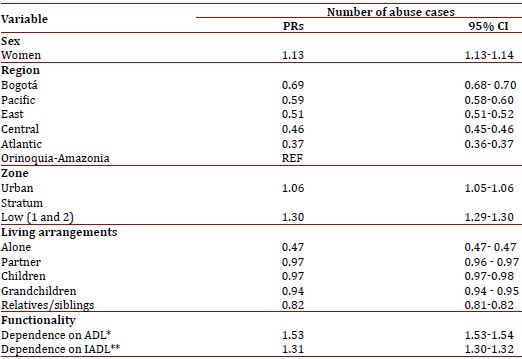 Methods: Cross-sectional and descriptive research. Data were taken from the SABE Colombia Survey, a population study, with a national representative sample of 23,694 adults aged over 60 years. Presence and type of abuse by partners or family members, members were investigated. Generalized linear models with Poisson link function were used to estimate the causes of the prevalence of abuse by area of residence, region, age, sex, dependence on activities of daily living and living arrangements.