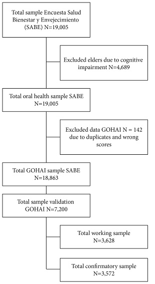 Both samples (WS and CS) were obtained randomly from the 18,863 subjects who responded the GOHAI scale, after eliminating duplicates, atypical data and GOHAI scores below 12 or above 60. Then, two samples (WS and CS), about 3,600 subjects each, were selected using proportional sampling fractions according to the gender, age-groups, and dwelling area (urban vs rural) variables among the 18.863 subjects selected from the whole survey. All the analyses were performed in both samples, in this manner at the end of the study, it counted with a sample of 7,200 subjects, divided into two groups of approximately 3,600 subjects each one.